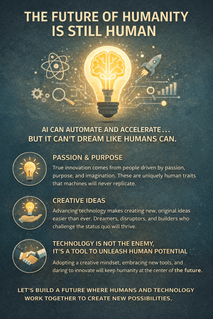 Machines can analyze, automate, and accelerate but they cannot dream. They can’t yearn, nor can they deeply care. At least not in the way humans do. Passion and purpose are still uniquely human traits and they remain at the heart of all meaningful innovations.